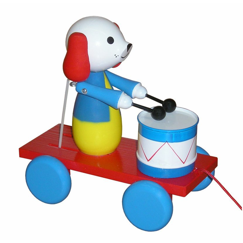 Tahací pes s xylofonem, s provázkem a kolečky. Když jej dítě tahá za sebou, pes při jízdě hraje na bubínek. Vyrobeno v České republice z kvalitního dřeva. Rozměry 20 cm x 20 x 12 cm.