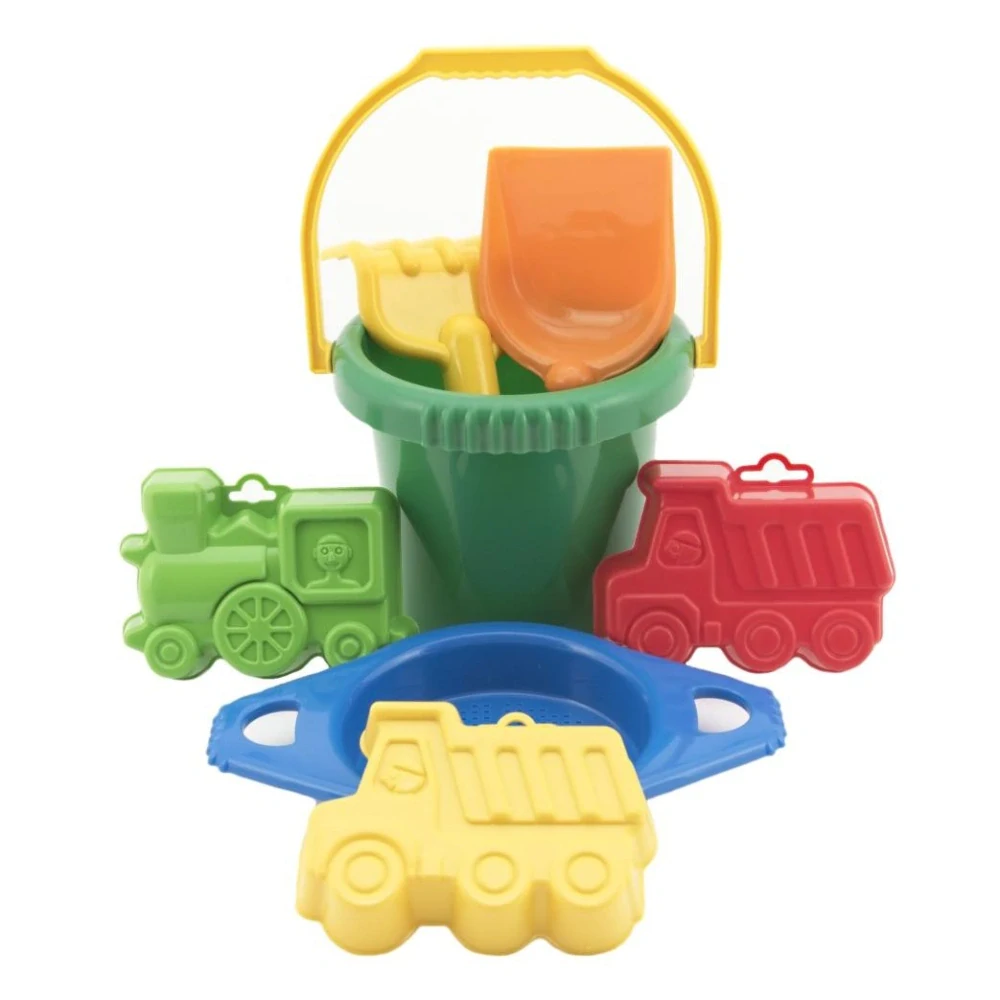 Plastová sada pro děti na písek. Sada obsahuje kbelík, sítko, hrabičky, lopatku a 3 bábovky.Vyrobeno v České republice z kvalitního plastu.