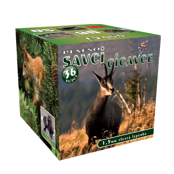 Pexeso z tvrdého odolného papíru v krabičce. S obrázky divokých zvířat. Společenská hra založená na koncentraci a tréninku paměti. Balení obsahuje 32 dvojic kartiček a návod ke hře. Rozměr kartičky 55 x 55 mm.