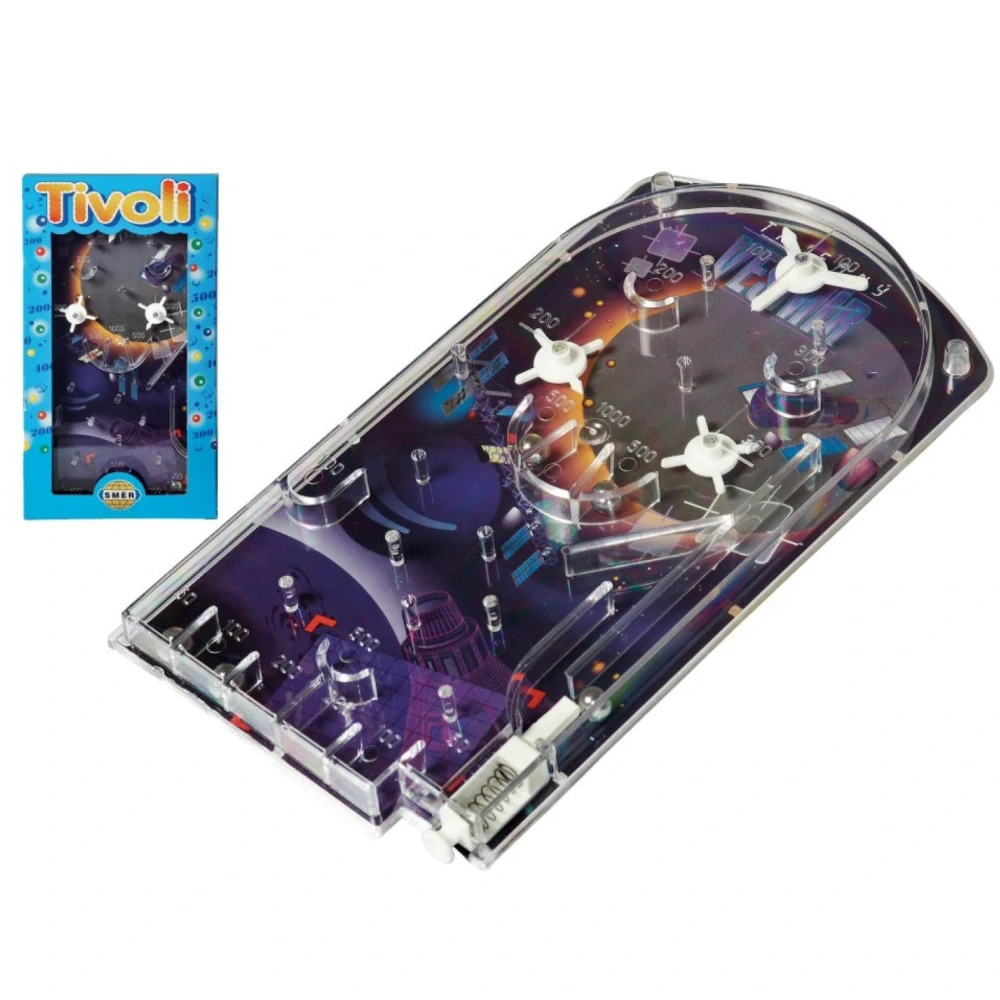 Společenská hra pinball Tivoli se vyrábí již desítky let. Natáhnutím pružiny vystřelíte kuličku do vesmíru - do hracího pole. Kulička pak probíhá mezi hřebíčky, aby určila výslednou výhru podle otvoru, ve kterém se zastaví. Rozměr balení 17x 31,5 cm.