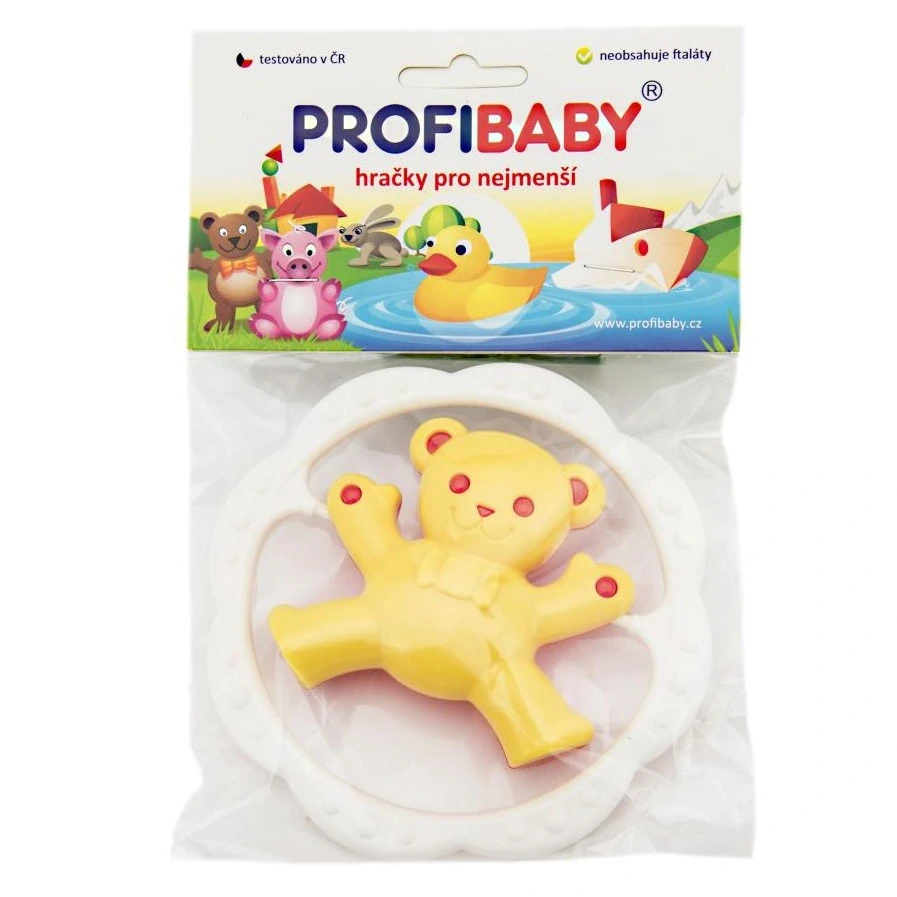 Pestrobarevné chrastítko s motivem medvěda vydává jemný chrastivý zvuk. S medvídkem lze otáčet kolem jeho osy. Rozvíjí motorické a zrakové dovednosti dítěte.