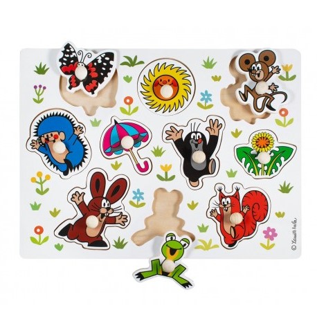 Dřevěné dílky tvarovaného puzzle s motivem Krtka musí dítě umístit do správného vyřezaného otvoru. Procvičuje tak jemnou motoriku ruky a prostorovou představivost. Rozměr balení: 30 x 22,5 cm.