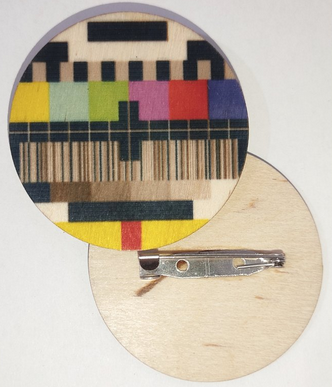 Dřevěná placka na připnutí s barevným potiskem - obrazcem zvaným monoskop (v počátcích televizního vysílání to byl zkušební obrazec, generovaný speciální elektronkou zvanou monoskop. Elektronkové televizory bylo nutno po zapnutí seřídit právě pomocí tohoto obrazce).
