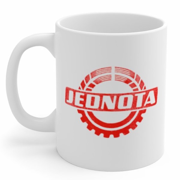 Keramický hrnek s logem Jednota (síť okresních lidovcýh spotřebních družstev, která provozovala venkovské prodejny potravin a pohostinství).