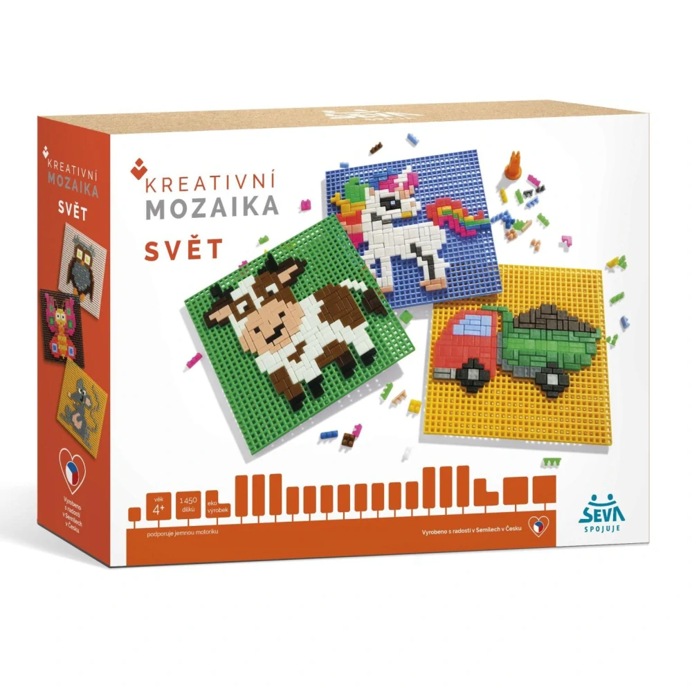 Kreativní mozaika Svět – rozvíjejte fantazii i jemnou motoriku! Základem stavebnice je plastová mřížka, do které se vmačkávají barevné dílky (celkem 17 barev) dle fantazie nebo předlohy a vznikají tak unikátní obrázky. Jde o EKO výrobek. Počet dílků: 1450 ks Rozměr balení: 31,5 x 22,5 x 7 cm