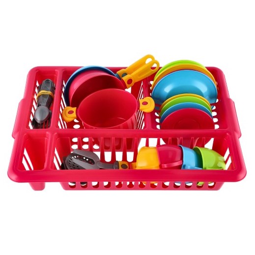 Sada barevného nádobí pro malé kuchaře a kuchařky. Obsahuje šálky, talířky, příbory, hrnce, pánve, obracečky a odkapávač pro umývání.